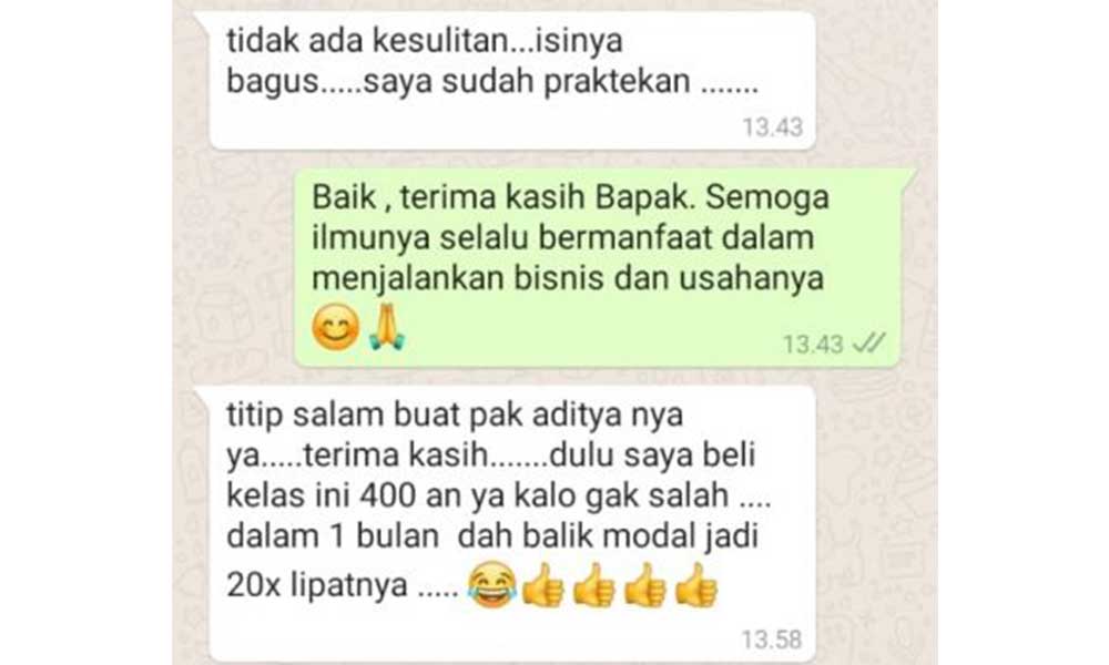 Teknik dan Strategi Internet Marketing Aditya telah teruji untuk Barang & Jasa mulai dari Rp 99 Ribu hingga Rp 4,5 Milyar Rupiah. Apapun Barang & Jasa Anda, Strategi nya kurang lebih sama dan pasti banyak sekali ilmu yang bisa Anda terapkan.